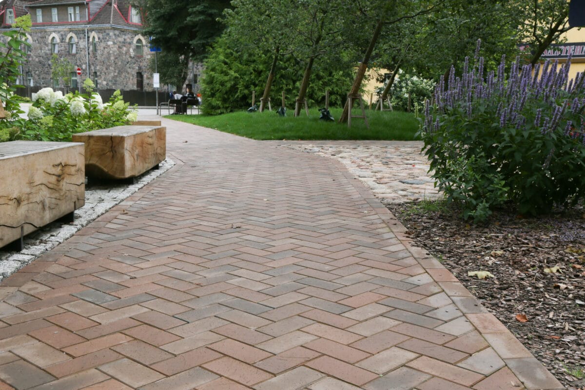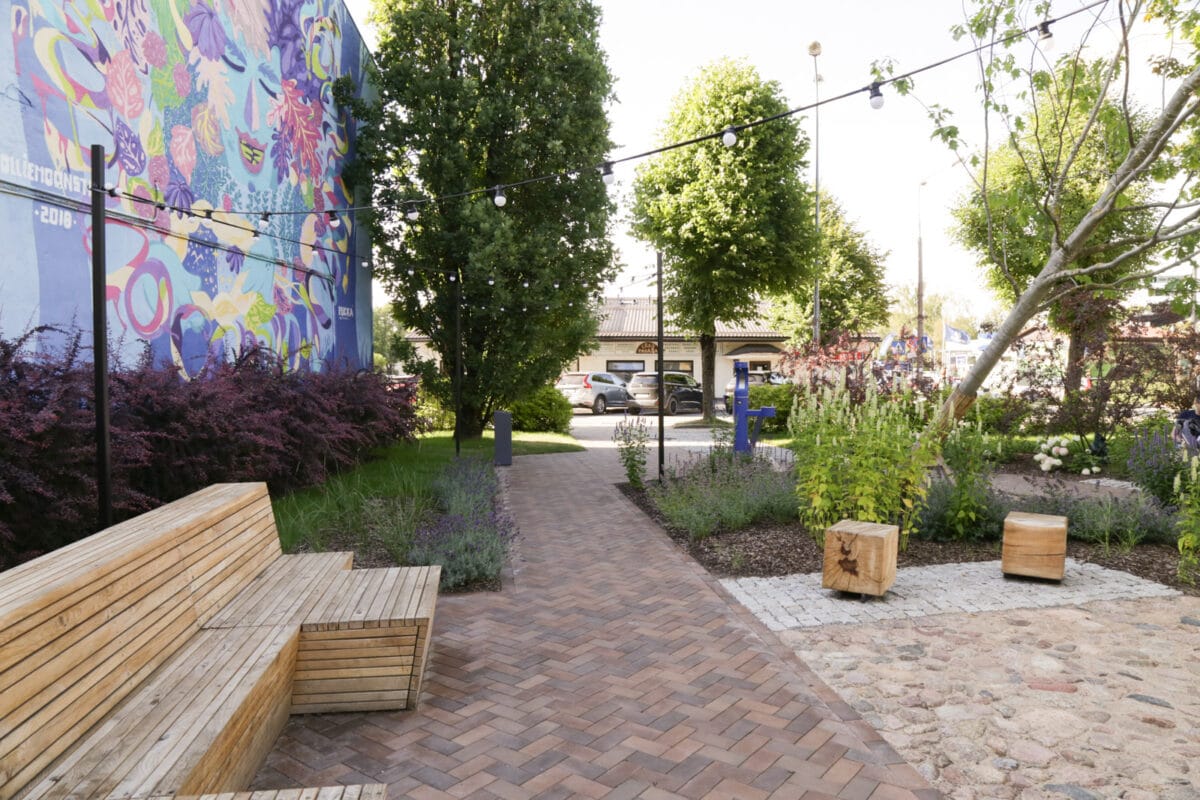 Lai skvēra vide būtu ne tikai pievilcīga, bet arī ilglaicīgi funkcionāla, celiņiem un laukumiem izvēlēts LODE klinkera bruģis TERRA. Tā silti sarkanbrūnais tonis lieliski iekļaujas dabas un koka arhitektūras elementos, veidojot dabisku un harmonisku vidi.